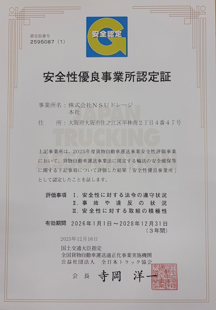 2026年からの『安全性優良事業所』Gマーク認定証頂きました。